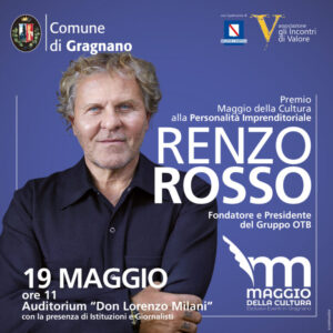 L’imprenditore Renzo Rosso sarà premiato come Personalità Imprenditoriale del “Mese della Cultura” di Gragnano, edizione 2023. La cerimonia di premiazione si terrà il 19 maggio presso l’Auditorium Don Lorenzo Milani in via Quarantola. Il premio, realizzato dall’artista Domenico Sepe, verrà consegnato dal Comune di Gragnano, con il Patrocinio della Regione Campania, e con il supporto della kermesse Gli Incontri di Valore.